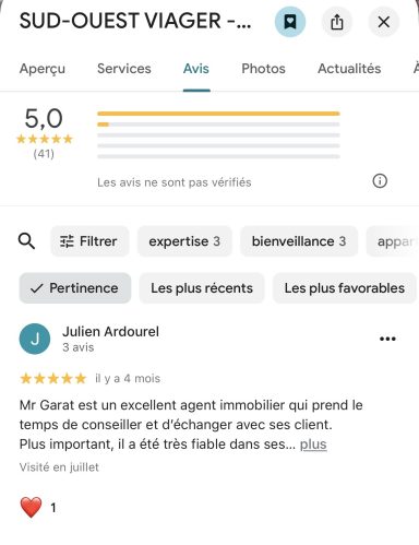 Ces avis Google réels, vérifiables et publics sont une garantie de confiance pour toutes les personnes qui envisagent de vendre ou d’acheter en viager dans le Sud-Ouest.
